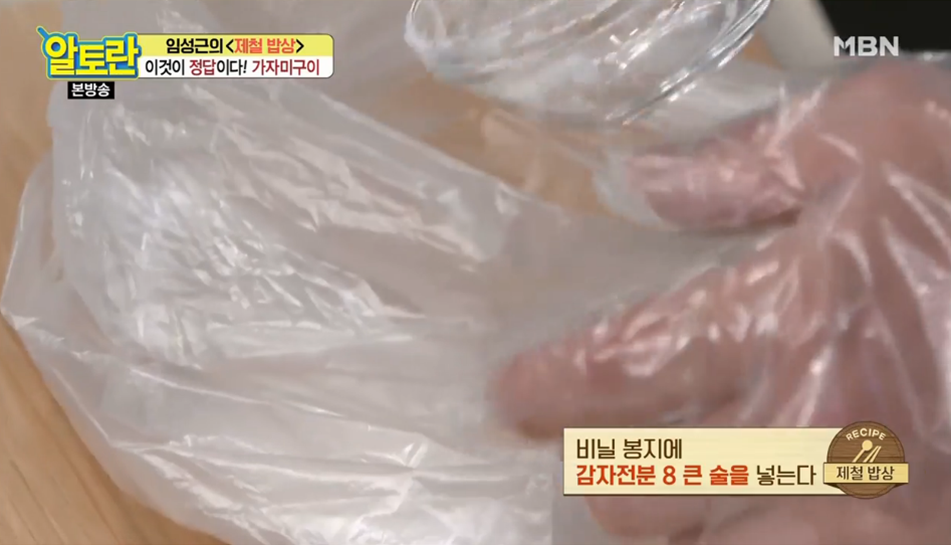 (9) 비닐 봉지에 감자전분 8큰 술을 넣는다.