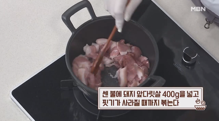 (2) 센 불에 돼지 앞다릿살을 넣고 핏기가 없어질 때까지 볶는다.