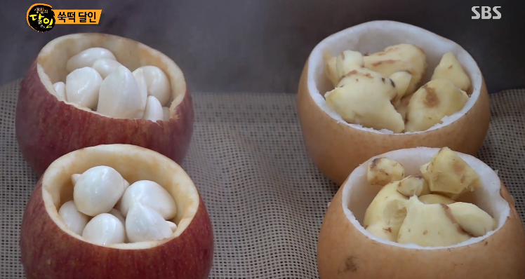 사과에 마늘을 가득 넣고, 배에는 생강을 가득 담아내는데요. 사과하고 마늘은 해독효능이 있고, 배하고 생강은 우리 몸을 따뜻하게 해주는 효능이 있습니다. 이렇게 찜기에 넣고 쪄낸 후에 고운 입자가 될때까지 잘개 빻은 후에 매주콩과 섞어냅니다. 이렇게 콩가루를 완성 시켜냅니다. 정말 정성이 많이 들어가죠? 보기만해도 고소해보이네요