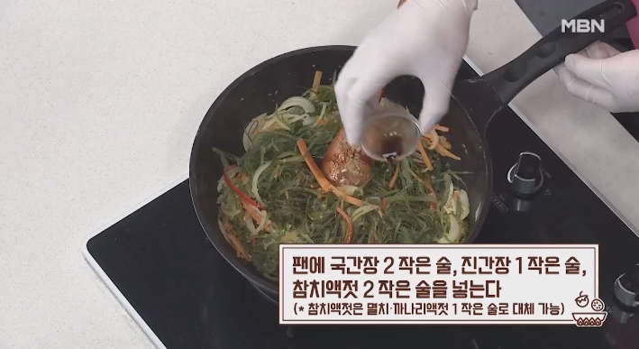 (8) 후라이팬에 국간장 2작은술, 진간장 1작은술, 참치액젓 2작은 술 넣는다.