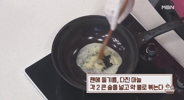 (4) 후라이팬에 들기름, 다진마늘을 각 2큰술 넣고 약불로 볶는다.