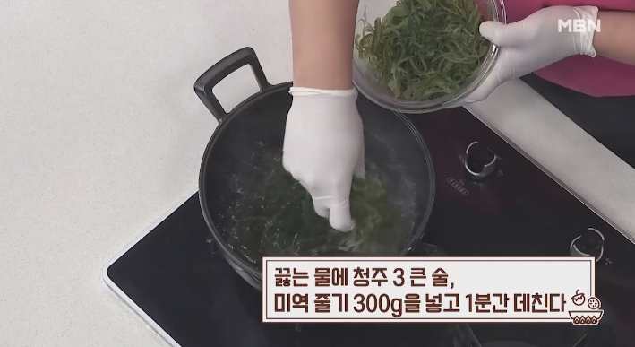 (2) 끓는 물에 청주 3큰술, 미역줄기 300g을 넣고 1분동안 데친다.