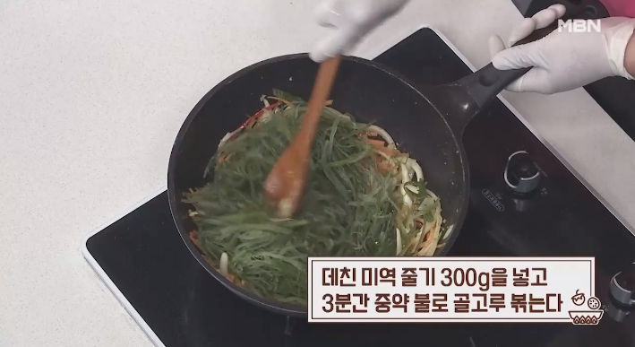 (7) 데친 미역 줄기 300g을 넣고 3분간 중약 불로 골고루 볶는다.