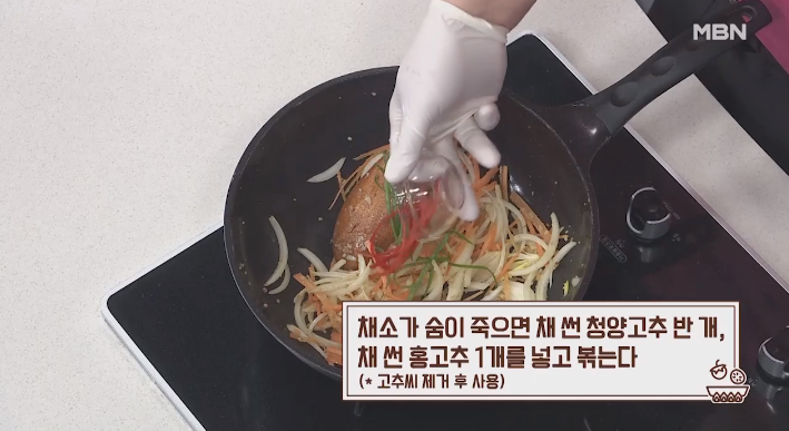 (6) 채소가 숨이 죽었을 때 채 썬 청양고추 반개, 채 썬 홍고추 1개를 넣고 볶는다.