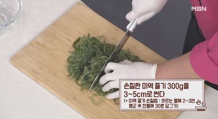 (1) 미역 줄기 300g을 3~5cm로 썬다.