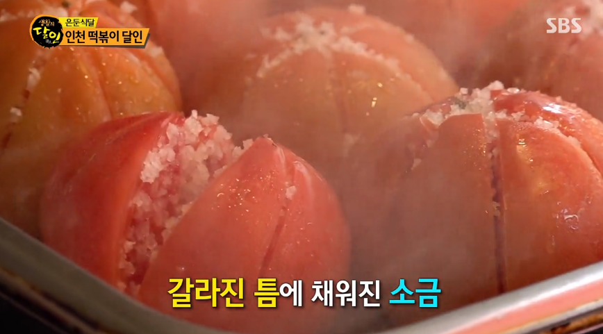 토마토에 소금을 올리면 단맛이 나오는 것 알고 계셨나요? 스파게티를 만들 때에도 이렇게 단맛을 내는데요. 인천 떡볶이 달인도 이런 방식으로 단맛을 내고 있었습니다. 토마토에 갈라진 틈새에 소금을 넣어서 단맛과 감칠맛을 더해줍니다.