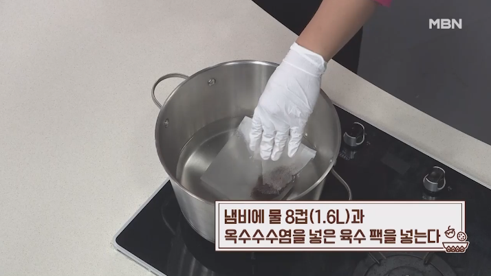 (5) 냄비에 물 8컵(1.6L)과 옥수수수염을 넣은 육수팩을 넣는다.