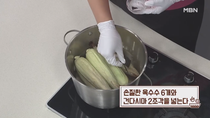 (7) 손질한 옥수수 6개와 건다시마 2조각을 넣는다.