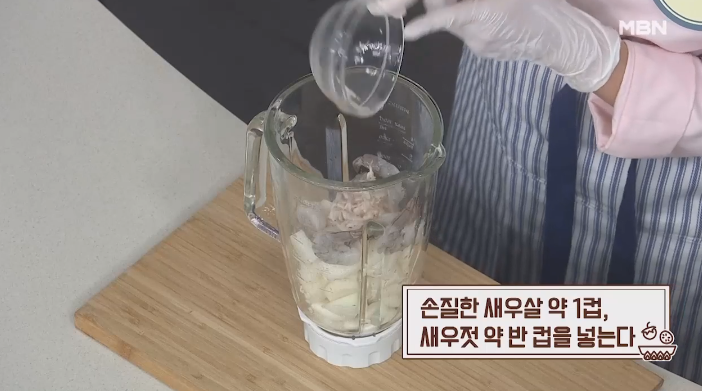 (9) 손질한 새우살 약 1컵, 새우젓 약 반컵을 넣는다.