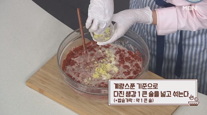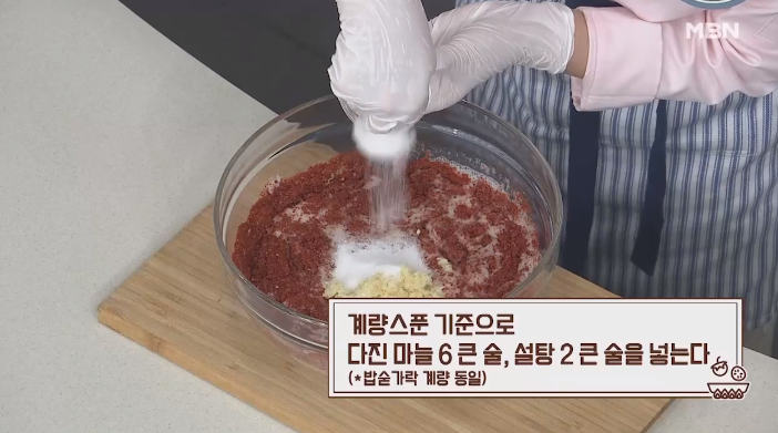 (13) 다진마늘 6큰술, 설탕 2큰술, 다진생강 1큰술 넣는다.