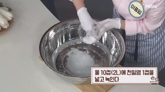 (3) 양동이에 물 10컵(2L)에 천일염 1컵을 넣고 녹인다.
