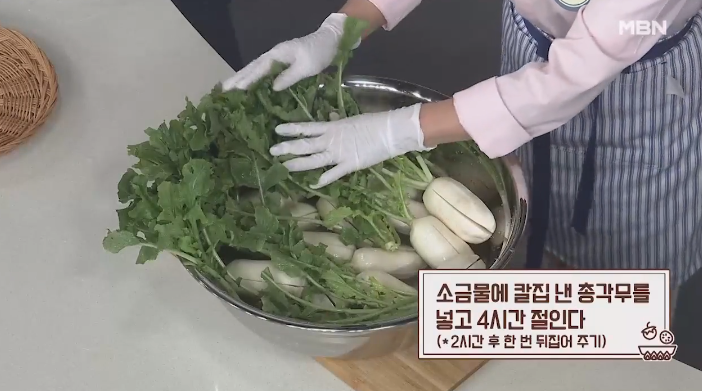 (4) 소금물에 칼집 낸 총각무를 넣고 4시간 동안 절인다.