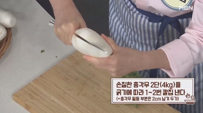 (2) 손질한 총각무 2단(4kg)을 굵기에 따라 1~2번 칼집낸다