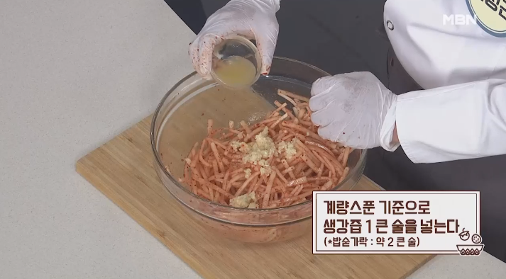 (5) 다진마늘 2큰술, 생강즙 2큰술을 넣고 버무린다.