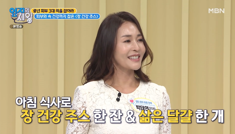 절대 동안 박태연씨는 아침 식사로 장 건강 주스 한잔 과 삶은 달걀 한개를 드신다고 합니다. 피부 건강을 위해서 아침 식사부터 노력을 하시네요. ^^