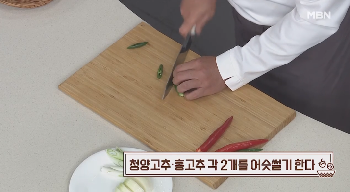 (15) 청양고추, 홍고추 각 2개 어슷썰기 한다.