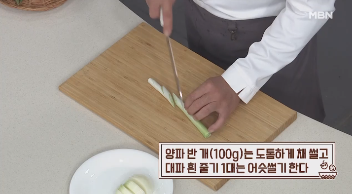 (14) 양파 반개를 도톰하게 채썰고, 대파 흰 줄기 1대를 어슷썰기 한다.