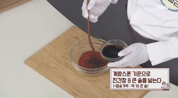 (5) 볼에 고춧가루 5큰술, 진간장 16큰술, 다진마늘 3큰술, 생강즙 2큰술 넣는다.