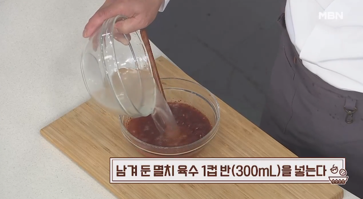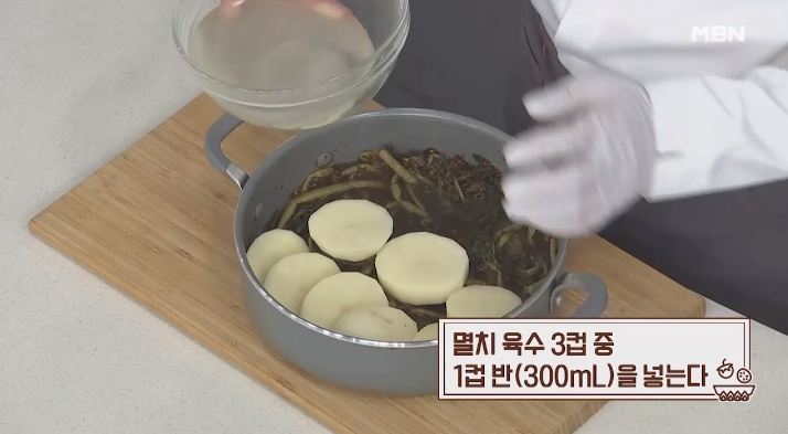 (10) 멸치 육수 3컵 중 1컵 반(300mL)을 넣는다.