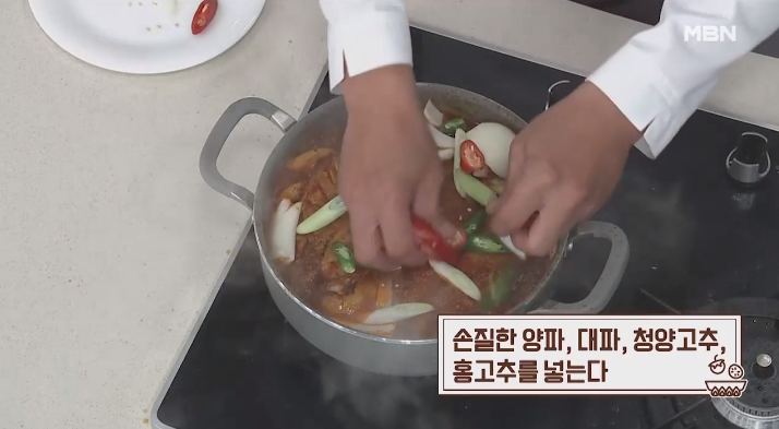 (16) 손질한 양파, 대파, 청양고추, 홍고추를 넣는다.