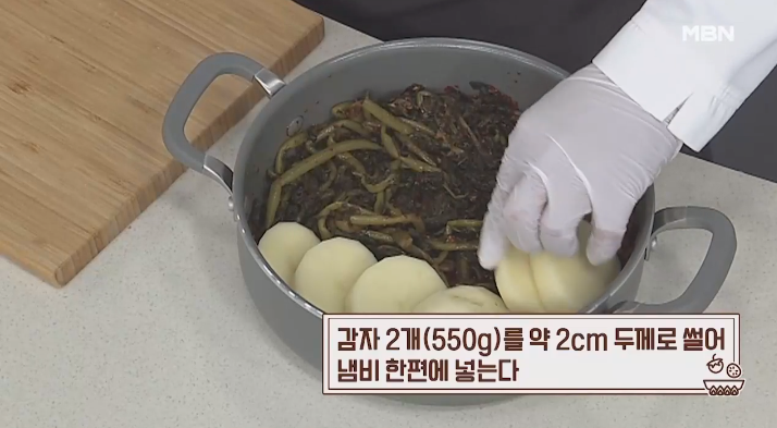 (9) 감자 2개(550g)를 약 2cm 두께로 썰어 냄비 한편에 넣는다.