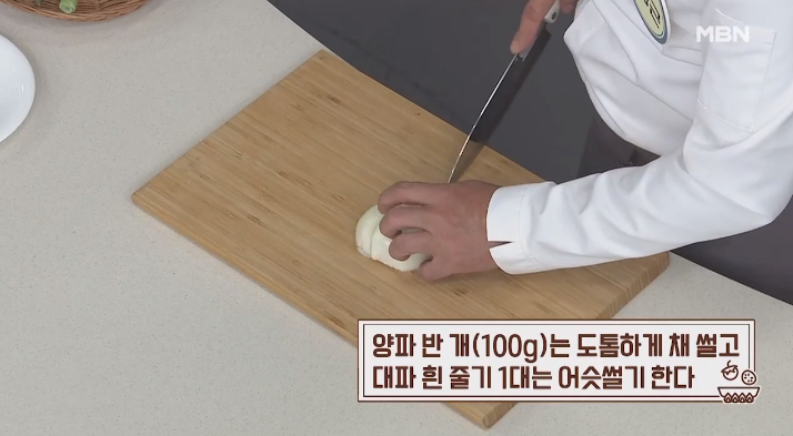 (14) 양파 반개를 도톰하게 채썰고, 대파 흰 줄기 1대를 어슷썰기 한다.