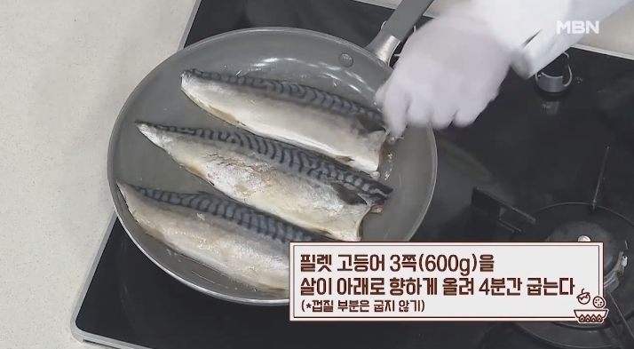 (3) 필렛 고등어 600g을 살이 아래로 향하게 올려서 4분간 굽는다.