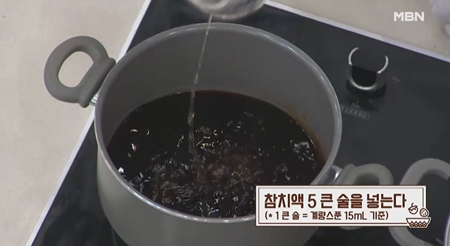 (5) 냄비에 진간장 160g을 넣고 맛술 50g, 참치액 5큰술 넣는다.