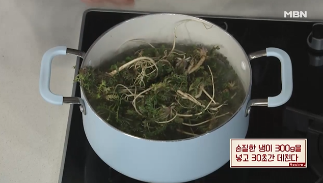 (4) 손질한 냉이 300g을 넣고 30초간 데친다.