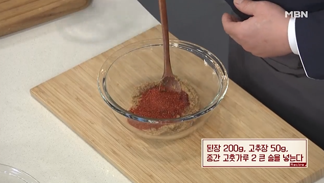 (1) 된장 200g, 고추장 50g, 중간 고춧가루 2큰술 넣는다.