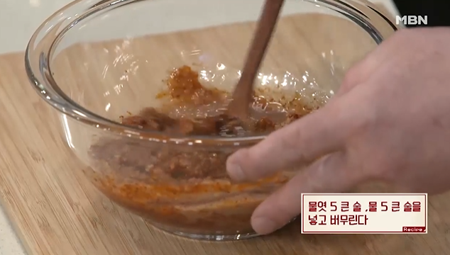 (2) 물엿 5큰술, 물 5큰술을 넣고 버무린다.