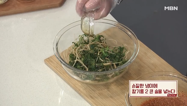 (7) 손질한 냉이에 참기름 2큰술 넣는다.