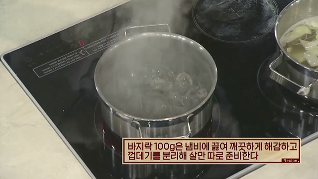 (7) 바지락 100g은 냄비에 끓여서 깨끗하게 해감하고 껍데기를 분리해 살만 따로 준비한다.