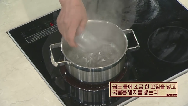 (5) 끓는 물에 소금 한 꼬집을 넣고 국물용 멸치를 넣는다.
