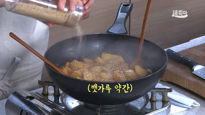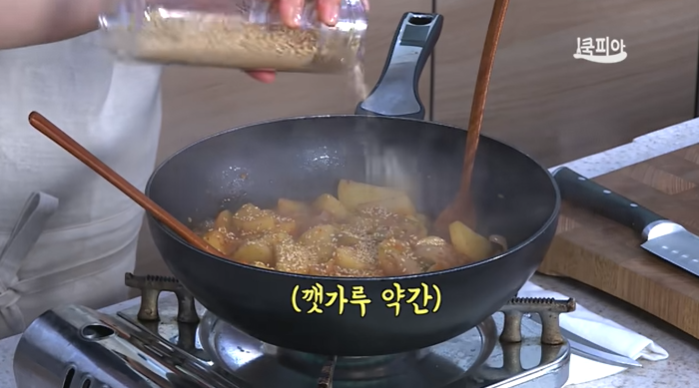 (7) 감자를 넣고 10여분간 더 끓여 거의 국물이 졸아들면 참기름, 통깨, 깻가루를 넣어 완성한다.