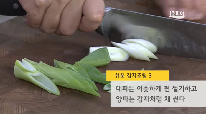 (3) 대파는 어슷하게 편 썰기 하고 양파는 감자처럼 채 썬다.