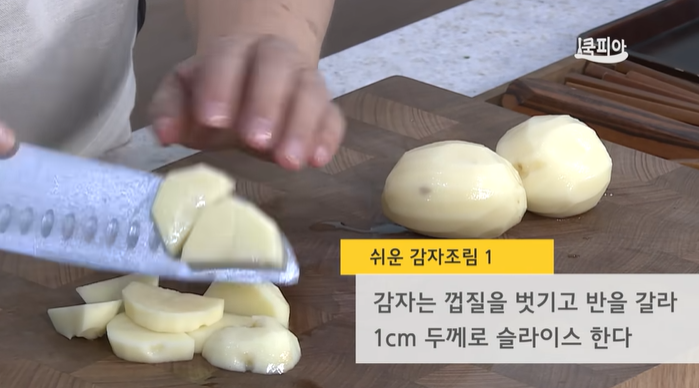 (1) 감자 껍질을 벗기고 반을 갈라 1cm 두께로 슬라이스 한다.