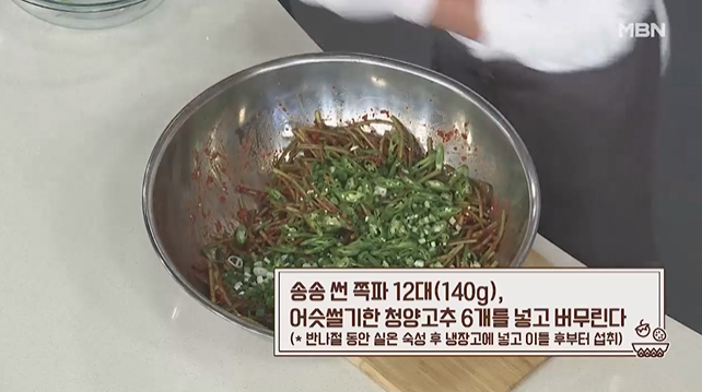 (10) 송송 썬 쪽파 12대(140g), 어슷썰기한 청양고추 6개를 넣고 버무린다.