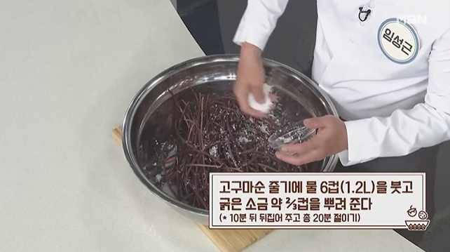 임성근 요리기능장님은 고구마순을 소금에 절여서 껍질을 까면 쉽게 깔 수 있다고 합니다.
