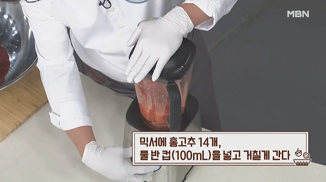 (6) 믹서에 홍고추 14개, 물 반컵(100mL)을 넣고 거칠게 간다.
