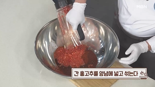 (7) 간 홍고추를 양념에 넣고 섞는다.