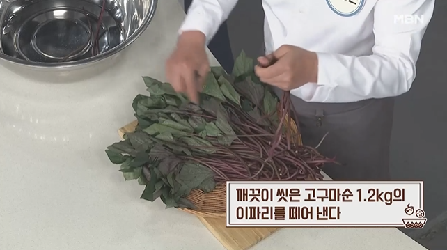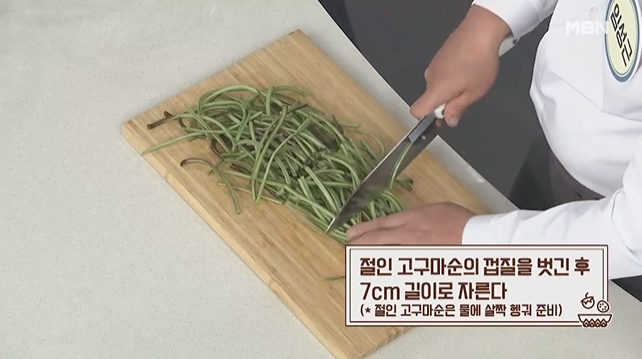 임성근 요리기능장님은 고구마순을 소금에 절여서 껍질을 까면 쉽게 깔 수 있다고 합니다.