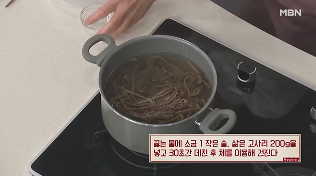 (1) 끓는 물에 소금 1작은술, 삶은 고사리 200g을 넣고 30초간 데친 후 체를 이용해서 건진다.