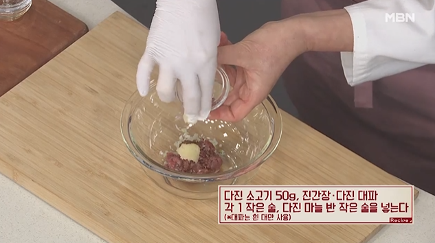 (7) 다진 소고기 50g, 진간장&다진 대파 각 1작은술, 다진 마늘 반 작은술 넣는다.