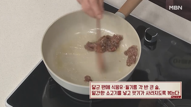 (9) 달군 팬에 식용유, 들기름 각 반큰술, 밑간한 소고기를 넣고 핏기가 사라지도록 볶는다.