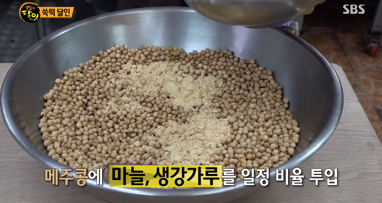 사과에 마늘을 가득 넣고, 배에는 생강을 가득 담아내는데요. 사과하고 마늘은 해독효능이 있고, 배하고 생강은 우리 몸을 따뜻하게 해주는 효능이 있습니다. 이렇게 찜기에 넣고 쪄낸 후에 고운 입자가 될때까지 잘개 빻은 후에 매주콩과 섞어냅니다. 이렇게 콩가루를 완성 시켜냅니다. 정말 정성이 많이 들어가죠? 보기만해도 고소해보이네요