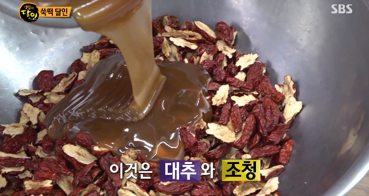 먼저 꾸지뽕 열매 달인물을 쓰고, 말린 대추를 조청에 섞어서 쑥과 함께 삶아 줍니다. 여기에 볶은 옥수수로 단맛과 구수한 향을 더해줍니다. 쑥을 삶는 과정만해도 보약을 만드는 과정과 비슷합니다.