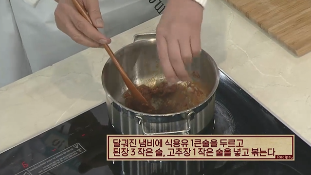 (9) 달궈진 냄비에 식용유 1큰술을 두르고 된장 3작은술, 고추장 1작은술을 넣고 볶는다.