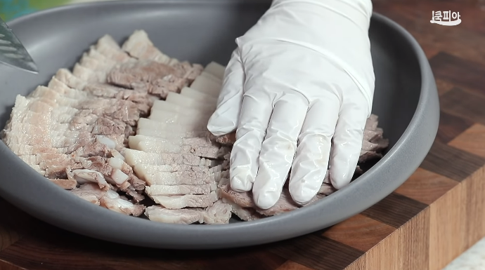 (8) 잘 익은 고기를 찬물에 한번 헹군 후 식혀서 얇게 썬다.