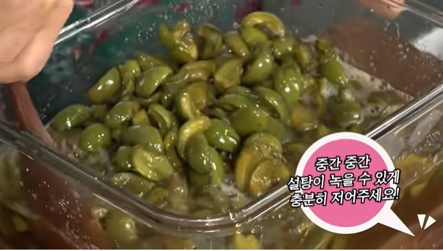 (6) 8시간정도 절인 매실장아찌를 중간 중간 설탕이 녹을 수 있게 충분히 저어주세요 !